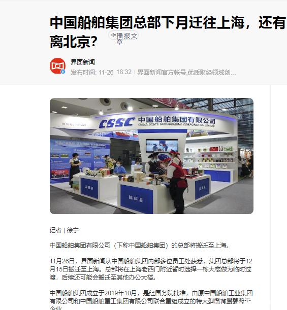 11月26日上海的官方媒體界面新聞報(bào)道:中國(guó)船舶集團(tuán)內(nèi)部多位員工處透露,集團(tuán)總部將于12月15日搬遷至上海。總部將在上海老西門附近暫時(shí)選擇一棟大樓做為臨時(shí)過渡,后續(xù)還可能會(huì)搬遷至其他辦公大樓。這是非常值得高興的好消息,上海又獲得一家世界五百?gòu)?qiáng)、全球制造巨頭。